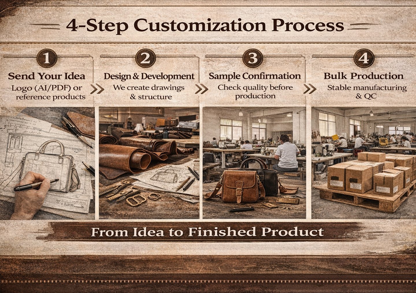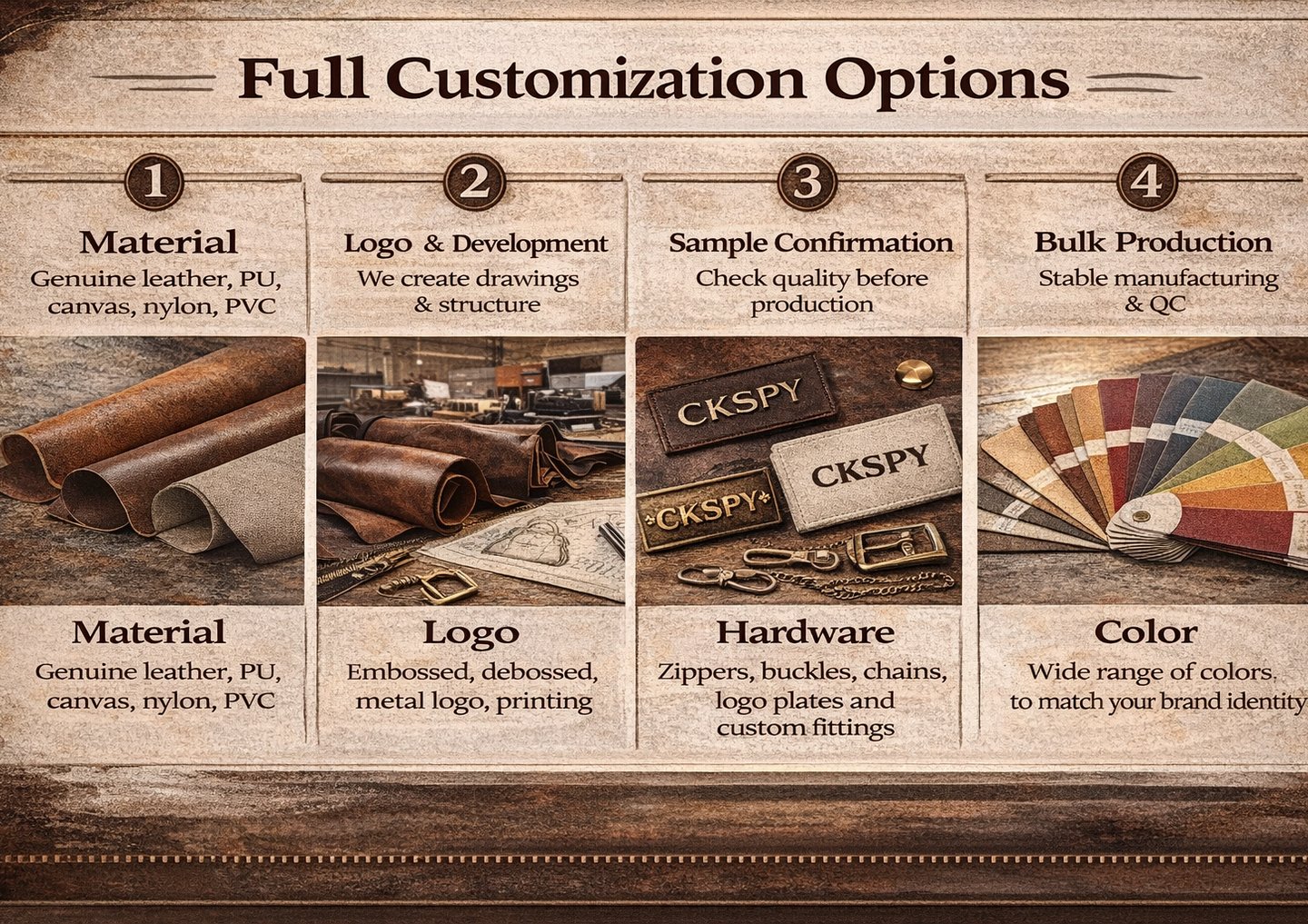 We provide full customization for materials, logos, hardware, and colors.